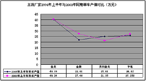 金龙客车单车产值基本于去年持平,下降0.15万元,下降0.3%;金旅客车单车产值比去年下降5.47万元,下降19.9%;苏州金龙单车产值有所增加,比去年增加3.66万元,增幅17%;宇通客车单车产值同比去年下降1.23万元,下降幅度4.5%。苏州金龙单车产值增加主要是今年上半年大型客车进入市场的结果。所以,在某种意义上说,今年上半年整个客车市场的购买客车金额降低。